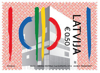 Two self-adhesive stamps. A, Bildmuseet in Umeå, Sweden, and the stylized Sami flag; B, the National Library of Latvia in Riga, and stylized Riga’s city flag. Multicolored.