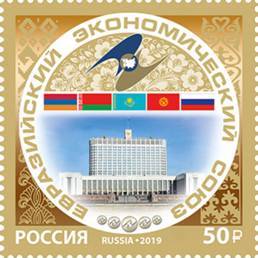 Similar stamps. The symbol of the EAEU, the five flags and a buiding. Armenia’s design is a puzzled with flags. Multicolored.