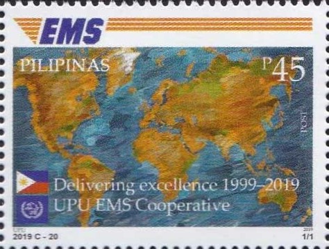 Identical stamps. World map, EMS symbol, flag of the country and of the United Nations; texts in English and Arabic, French, Portuguese, Russian or Spanish. Multicolored.