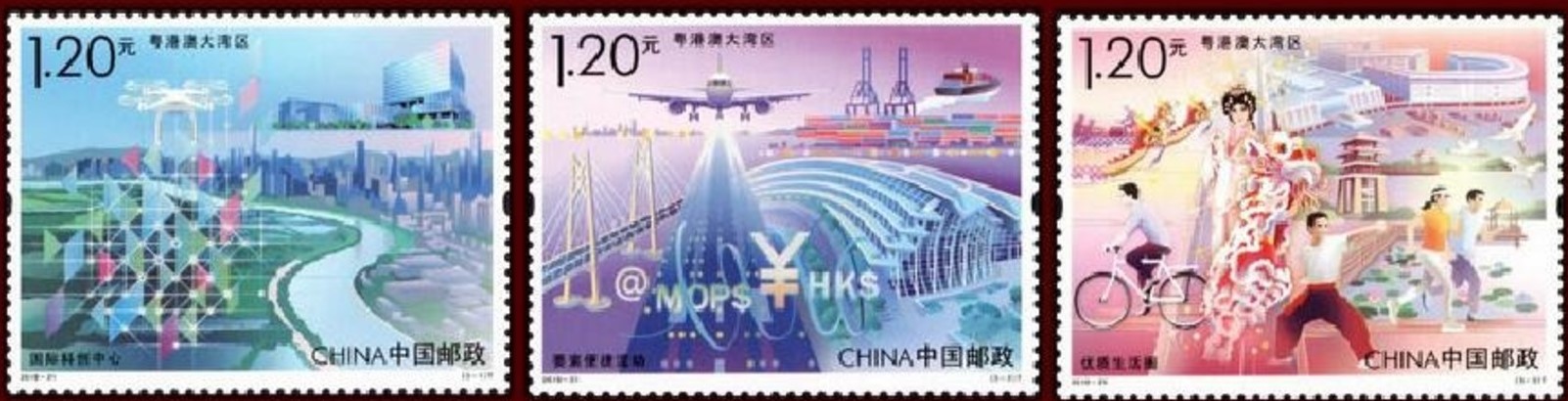 Different stamps depicting topics such as International Center of Innovative Technology; Facilitating flows of factors of production; High-quality life circle; map of the area with name and symbol of all involved sub-regions; skyline. Multicolored.
