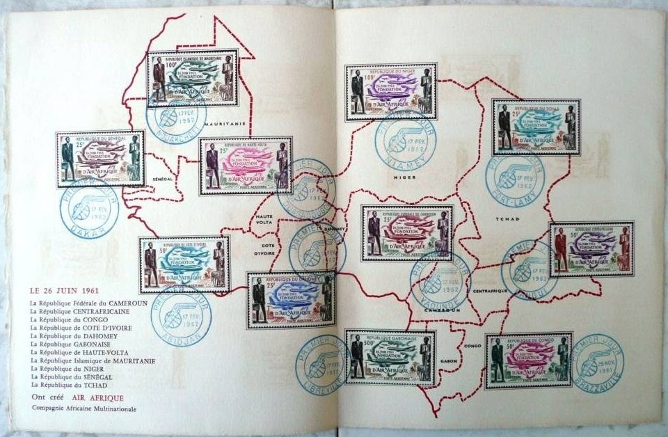 Jaap Sarelse (The Netherlands) continues providing information about mixed folders. Here is an interesting one, from February 17, 1962 collecting on a same page all stamps (11 countries, 11 stamps) from the 1962 Air Afrique series with first day cancellations. This document was produced at 999 samples and is of private origin.