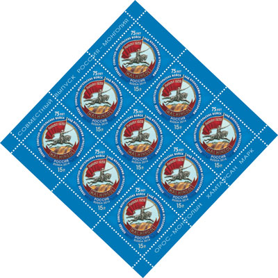 Grzegorz Omelanczuk (Poland) provided the first image of the Russian stamp from the Russia Mongolia joint issue to be released on August 28, 2014. The stamp (printed at 31,000 miniature sheets of 9 stamps for Russia) commemorates the 75th anniversary of the victory of the battle that was led by the Russian and Mongolian troops against the Japan and the Mandchukuo in 1939. This battle resulted in the stop of the war and the signature of an armistice on September 15, 1939.