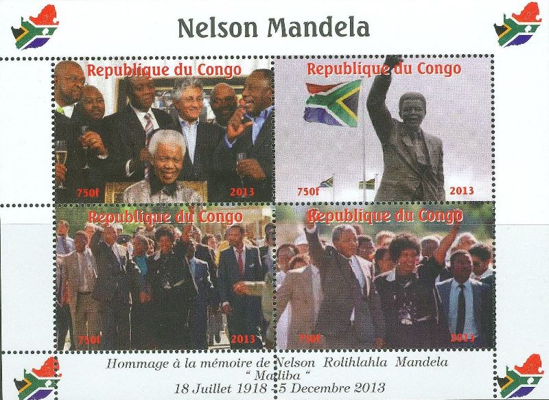 Additional information has been found concerning the Nelson Mandela series. Chad, Republic of Congo and Mali have each issued three (and not two) souvenir sheets with 4 different stamps. Each souvenir sheet exists in two forms with different margins. The margin we have already described earlier shows two Concorde planes and the logo of the SANSA. A new form is also available bearing the South African flags with the shape of the country at each corner of the souvenir sheet. So in total each country has issues 6 different souvenir sheets. On top of this, all souvenir sheets are available as perforated and imperforate, which makes a total of 36 different souvenir sheets. The exact dates of issue are still unknown.