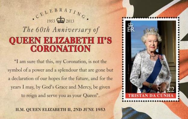 Mansoor discovered also a series of stamps related to the 2013 Diamond anniversary of the coronation of QEII and issued by Saint Helena, Ascension and Tristan da Cunha released on February 6, 2013. These souvenir sheets look like joint issues, but as these three islands are connected, the series was supposed initially to be reported as territorial. In the meantime we discovered that other countries have issues the same set of similar stamps, i.e the souvenir sheet depicted below, a miniature sheet with nine stamps and a set of five different stamps.