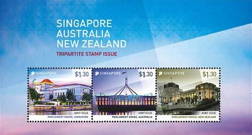 representing the parlament house of each country. Australia and Singapore issued three stamps and a souvenir sheet integrating the three stamps. New Zealand released only one single stamp representing the New Zealand parlament house. FDCs, maxi cards, mixed FDC covers and presentation packs are also available.
